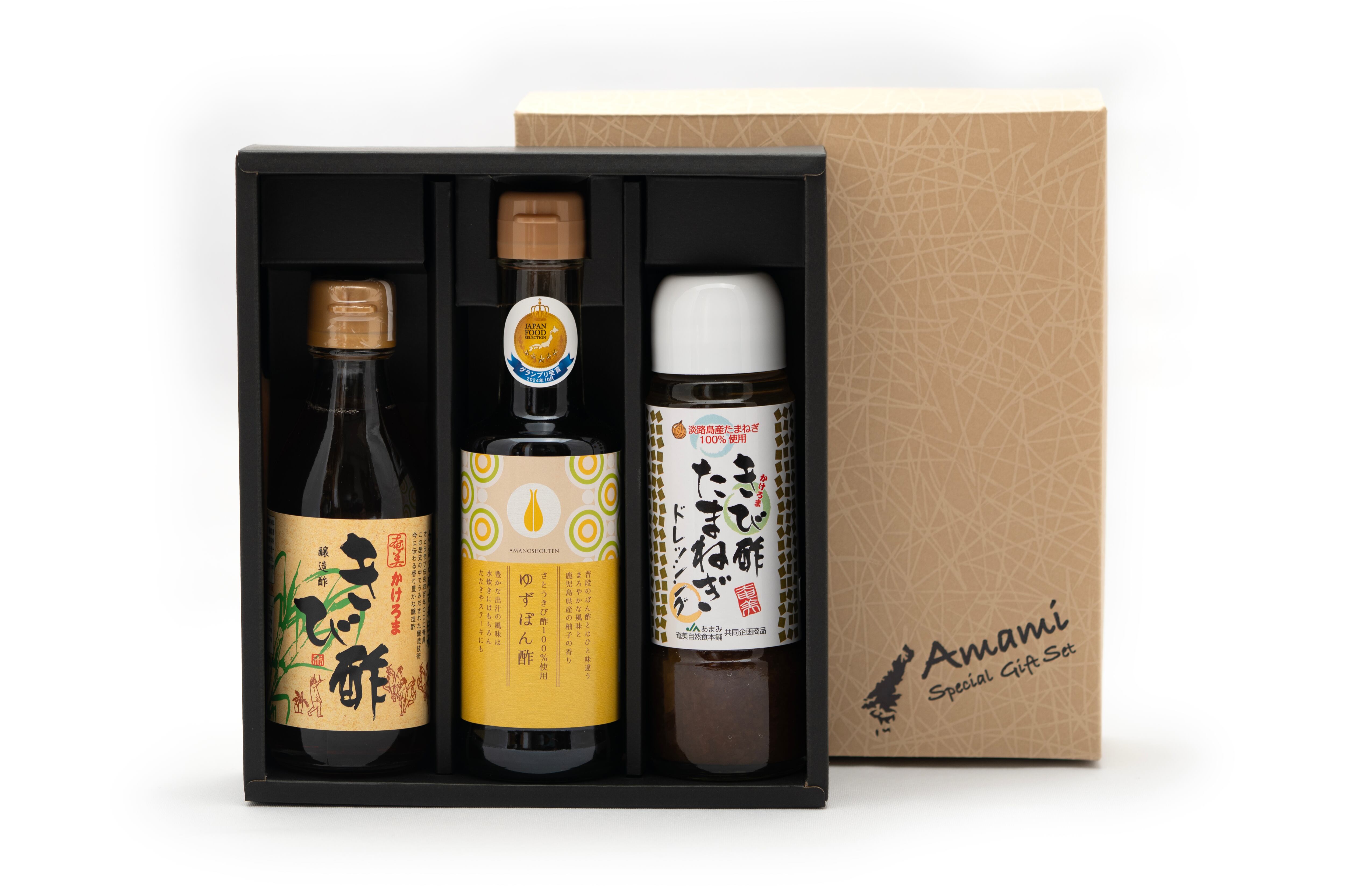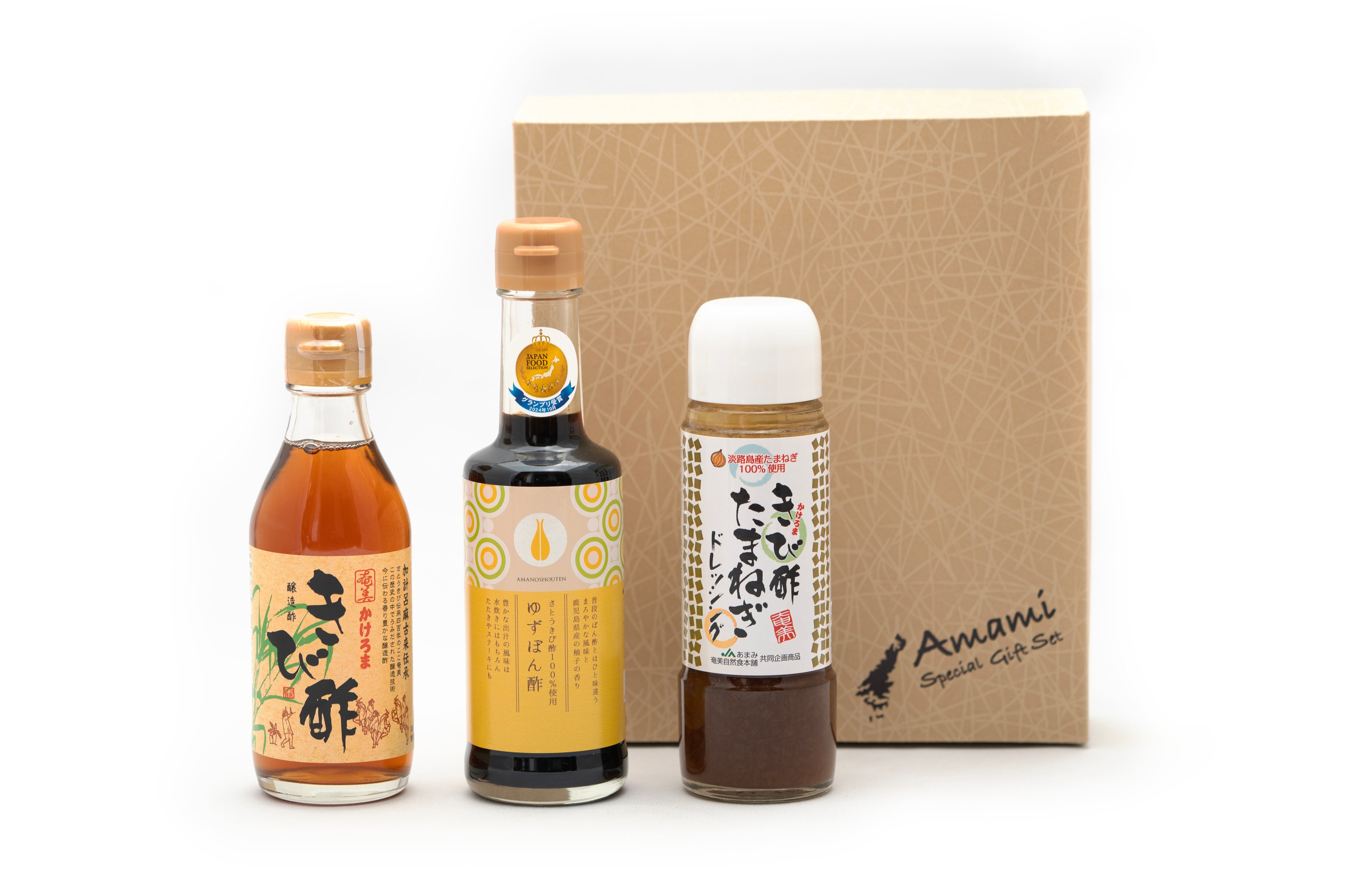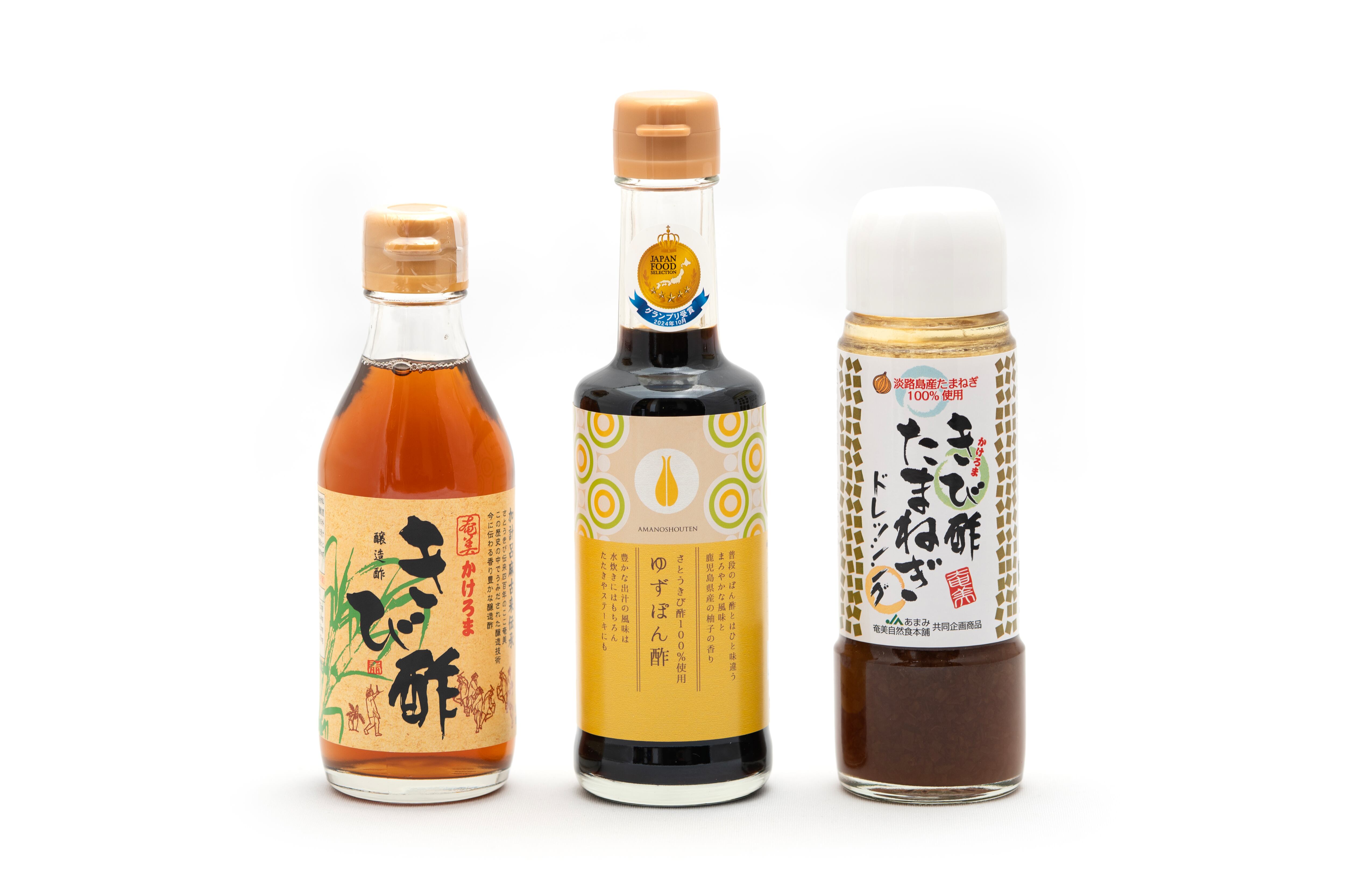 ・セット内容:奄美かけろまきび酢(200ml)、さとうきび酢100%使用ゆずぽん酢(220g)、きび酢たまねぎドレッシング(200ml)